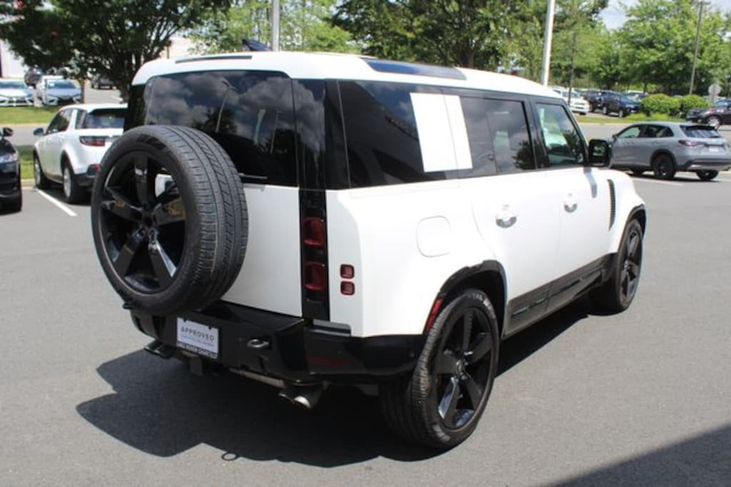 The Certified 2025 Land Rover Defender 110 X Dynamic SE in Fuji White from Land Rover Chantilly is equal parts muscle and masterpiece. The Fuji White finish with the Extended Black Exterior Pack and 22 inch Gloss Black wheels gives it a bold, tailored presence that looks unstoppable standing still.