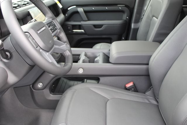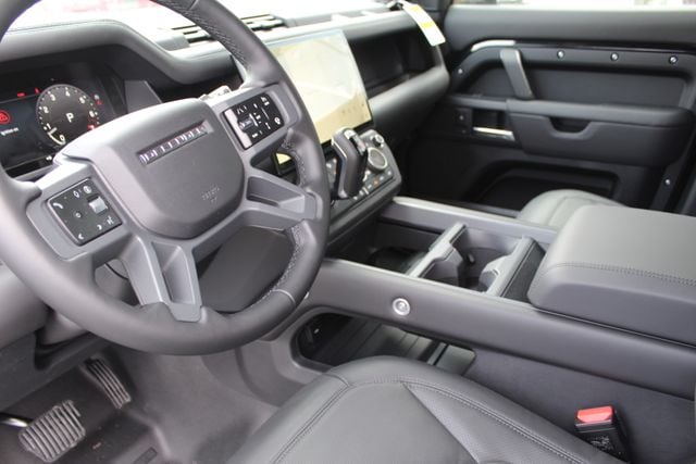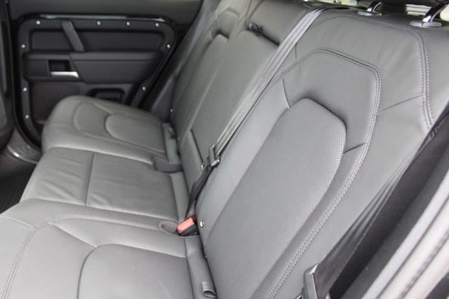 The Black Design Pack sharpens the exterior with darker accents and twenty inch gloss dark grey wheels. Fixed black side steps make entry easy and natural. The body colored spare wheel cover keeps the rear clean while still reminding everyone this Defender is built for real use. The ClearSight rear view mirror uses a live camera feed so cargo never blocks your view.