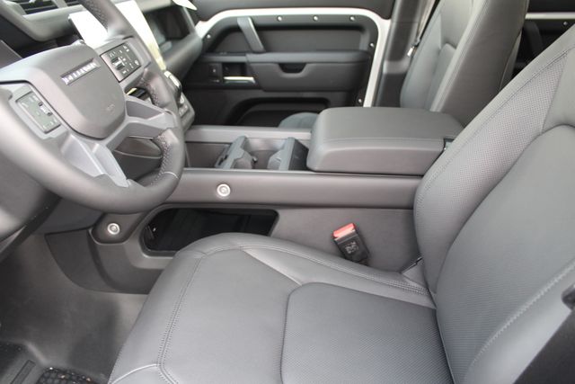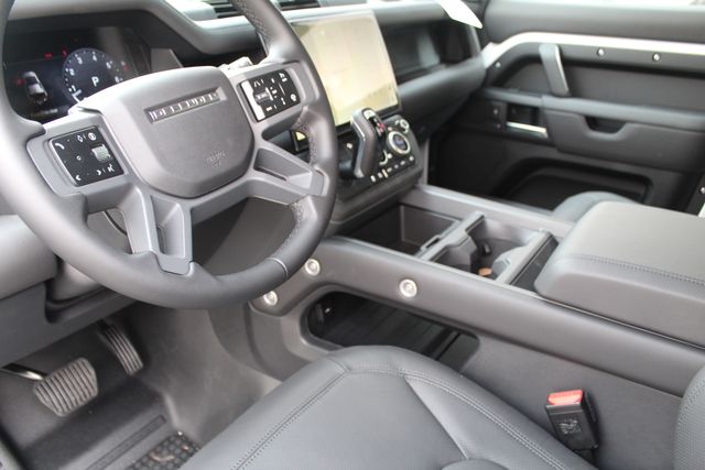 This Defender is optioned with intention. The Air Suspension Pack gives you adjustable ride height and adaptive dynamics, so it can cruise comfortably during the week and handle rough terrain without hesitation on the weekend. The Black Design Pack, Narvik Black contrast roof, gloss black wheels, and black fixed side steps give it a darker, more aggressive stance that looks ready for anything at all times